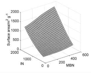 為了描述亞甲基藍和碘的數量相對于表面積的行為,使用二次模型。對于模型開發,Kennard-Stone算法從105個樣本中選擇了27個樣本并用于校準。樣品表面積從199到2105 m 2 g -1不等。亞甲基藍的數量在0到501毫克克每升之間,碘值從155到1670毫克克每升。建模后獲得的表面擬合(圖1)由公式4描述。