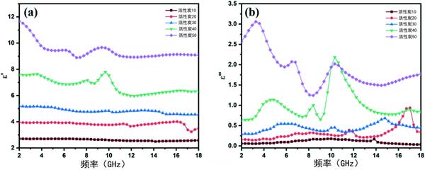 圖3:(a)載鉬活性炭-石蠟復合材料的相對復介電常數的實部和虛部,填充量從10%到50%不等。