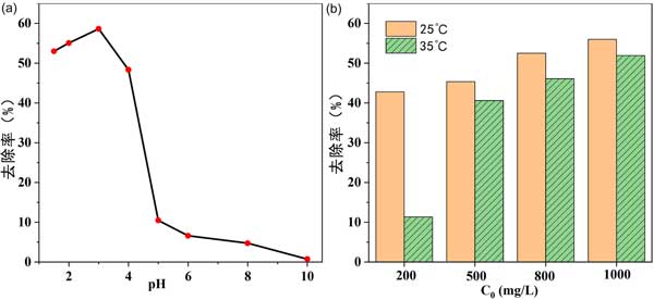 溫度也影響吸附過程。考察了不同溫度下不同濃度醋酸溶液的吸附過程,其他條件不變。結果如圖2(b)所示。對于不同濃度的乙酸稀釋劑,25℃時的吸附去除率高于35℃時的吸附去除率,表明吸附過程是放熱的。因此進一步的實驗僅在25℃下進行。對于工業應用,室溫條件是可行的,無需提供額外的熱源。