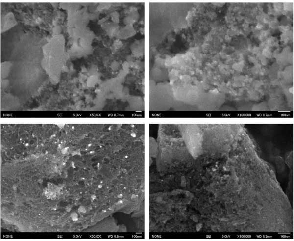 使用掃描電鏡在不同放大倍數下觀察氧化前(活性炭1)和氧化后(活性炭2)的表面形貌。根據SEM顯微照片在圖2,兩者的活性炭具有不同的形狀和孔的尺寸高度異質的表面。