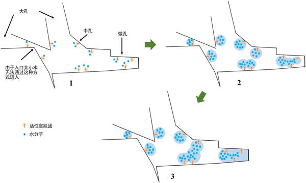 不同碳化溫度制備的活性炭1、2具有相似的吸附形狀,水的吸附形狀、吸收和滯后受表面官能團、孔徑、孔體積和孔連通性的強烈影響。為了解釋這一點,圖3說明了活性炭吸附水的理論機制。并非所有官能團對水分子都具有相同的親和力。但是羧基可以有很好吸引水分子。這次制造的活性炭具有羧基官能團,然后理論上作為水附著在活性炭表面的初始位點(圖3-1)。隨著更多的水被吸附,水-水開始通過氫鍵相互作用,然后形成簇(圖3-2)。如果每個官能團之間的距離足夠近,在合適的孔徑和大量或可接近的活性官能團,每個相鄰的水團可以合并并填充微孔(圖3-3)。活性炭的這種吸附能力的提高主要是由于在溫和條件下經過空氣處理后含氧表面官能團的增加和活性炭的孔隙發展引起的。