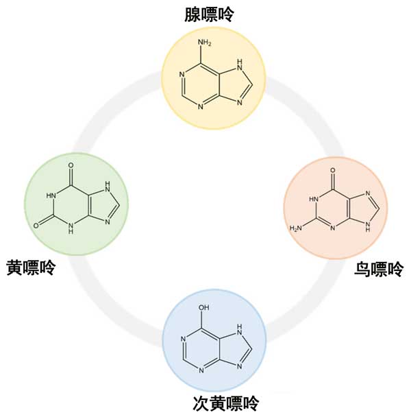 嘌呤化合物在所有生物體中都至關(guān)重要。嘌呤,其是指取代的嘌呤和各自的互變異構(gòu)體,如示于通過(guò)嘧啶的融合和咪唑環(huán)形成的,雜環(huán)芳香化合物(圖1)。這類(lèi)化合物包括堿基、核苷和核苷酸,一些例子是腺嘌呤、鳥(niǎo)嘌呤、次黃嘌呤和黃嘌呤(圖2)在哺乳動(dòng)物中,嘌呤更常見(jiàn)地表達(dá)為核酸,例如核糖核酸和脫氧核糖核酸(分別為RNA和DNA),它們包含兩個(gè)嘌呤堿基腺嘌呤和鳥(niǎo)嘌呤,以及幾種單分子核苷酸,如ATP、ADP、單磷酸腺苷(AMP)和環(huán)磷酸腺苷(cAMP),以及在較小程度上,鳥(niǎo)苷三磷酸(GTP)和環(huán)磷酸鳥(niǎo)苷(cGMP)。