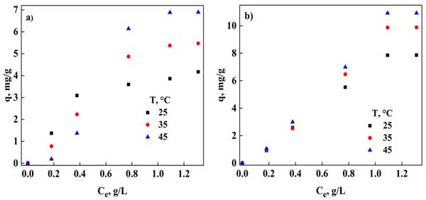 平衡吸附分析使我們能夠獲得不同等溫線模型的參數,表明在去除污染物時進行了何種類型的過程。在圖1中,顯示了使用粉末活性炭(圖1a)和活性炭(圖1b)在不同溫度下DNS的吸附能力。還觀察到3,5-二硝基水楊酸在兩種吸附劑中的吸附都隨著溫度的升高而顯著影響,隨著溫度的升高呈現出更大的吸附。因此,在45℃時,活性炭和粉末活性炭的大吸附容量分別為6.97和11.57mg/g。這可能是由于去除過程的環(huán)境,這會導致吸附劑表面隨著溫度的升高而增加其對3,5-二硝基水楊酸吸附的參與。使用商用活性炭的文獻中也報道了類似的行為。在其他研究中,使用這種吸附劑還觀察到,基于苯酚、高氯酸鹽和重金屬等的不同化合物的吸附能力有所增加。