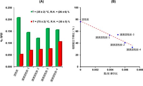 甲基碘吸附容量的降低程度取決于活性炭的性質(zhì)(圖2(A))。正如預(yù)期的那樣,對(duì)于未浸漬的吸附劑觀察到有害的影響,其中僅已知不涉及CH3I吸附的特定相互作用。更準(zhǔn)確地說(shuō),當(dāng)從活性炭材料的第一組條件轉(zhuǎn)移到第二組條件時(shí),概述了大約76%的吸附容量下降(圖2)。在這方面,為了克服與水蒸氣和溫度相關(guān)的影響,三乙二胺浸漬是必不可少的。最近,由于水對(duì)三乙二胺分子具有很強(qiáng)的親和力,因此三乙二胺浸漬可以通過(guò)釋放載體的活性位點(diǎn)來(lái)提高活性炭的保留性能]。此外,與其他機(jī)制(尤其是物理吸附)相比,化學(xué)吸附甲基碘的比例隨著溫度升高而增加。然后,三乙二胺與甲基碘的化學(xué)反應(yīng)性將在較高溫度下增強(qiáng)。得到的結(jié)果(圖2)表明隨著氮含量的增加,在“惡劣條件”下的保留性能逐漸提高。因此,以浸漬中含量最高為特征的活性炭-4吸附劑的吸附容量?jī)H降低了33%。更準(zhǔn)確地說(shuō),可以推斷出所有考慮的吸附劑的減少幅度和摩爾比之間的準(zhǔn)線性關(guān)系(圖2B)。根據(jù)這種關(guān)系,似乎需要浸漬,以確保在更嚴(yán)格的條件下更牢固地固定甲基碘。