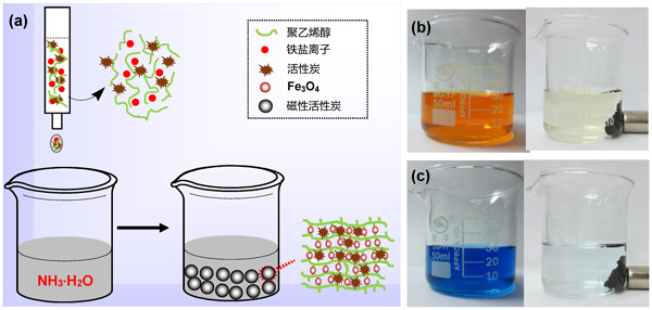 圖1:(a)磁性聚乙烯醇/活性炭復合凝膠制備示意圖。(b)亞甲基藍和(c)甲基橙的水溶液在(左)和(右)被活性炭磁性吸附劑吸附之前和之后(右)的照片。
