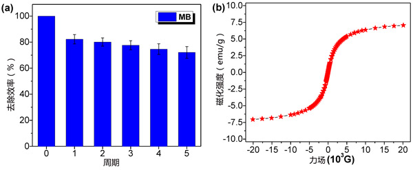 首先,研究了活性炭含量對磁性吸附劑吸附能力的影響。為了比較,活性炭的吸附容量也在相同條件下確定。在較高的初始染料濃度(5.0mM)下,磁性活性炭對MB和MO的飽和吸附能力明顯增加,隨著活性炭含量的增加。但是對于實際的吸附應用,非常需要具有良好可重復使用性的吸附劑。我們通過使用乙醇作為洗脫劑來評估吸附MB的磁性活性炭的可重復使用性。如圖3a所示,解吸的磁性活性炭的去除效率隨著重復使用次數的增加而降低。與原來的去除效率相比,經過5個解吸-吸附循環后,去除效率保持在72.1%左右。盡管如此,再生的活性炭的吸附能力仍然比較高,高于傳統的磁性吸附劑。此外,即使經過5次再生吸附循環后,磁性活性炭仍表現出與新制備的相似的飽和磁化強度值(圖3b),表明這次的新型吸附劑具有良好的結構穩定性。
