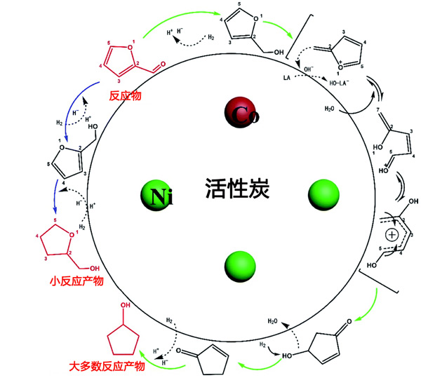 圖3:活性炭載鎳鈷催化劑上糠醛加氫的反應過程。