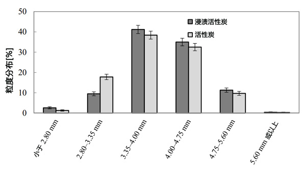 在一系列實(shí)驗(yàn)中使用了用碘酸和無(wú)機(jī)酸浸漬的顆;钚蕴。根據(jù)測(cè)量粒度分布、堆積密度和甲苯吸附能力,和測(cè)量浸漬活性炭的pH值。粒度按篩子大小分類。通過(guò)測(cè)量包裝在200mL容器中的浸漬活性炭的重量來(lái)計(jì)算堆積密度。通過(guò)將1/10甲苯蒸氣流到10g浸漬活性炭中,測(cè)量甲苯蒸氣吸附前后的重量差,計(jì)算出甲苯吸附容量。將3g浸漬活性炭加入300mL離子交換水中并搖動(dòng)30分鐘,制成活性炭樣品再進(jìn)行pH測(cè)量。圖1顯示了浸漬活性炭和活性炭的粒度分布。對(duì)于浸漬活性炭和活性炭,粒徑均為2.80-5.60毫米。這些粒徑通常是氣體處理的值。通過(guò)浸漬,堆積密度增加,甲苯吸附能力降低。這可能是由于浸漬材料滲入了孔隙。由于金屬的雜質(zhì),活性炭的pH值呈堿性。由于酸解離,通過(guò)浸漬降低了pH值。