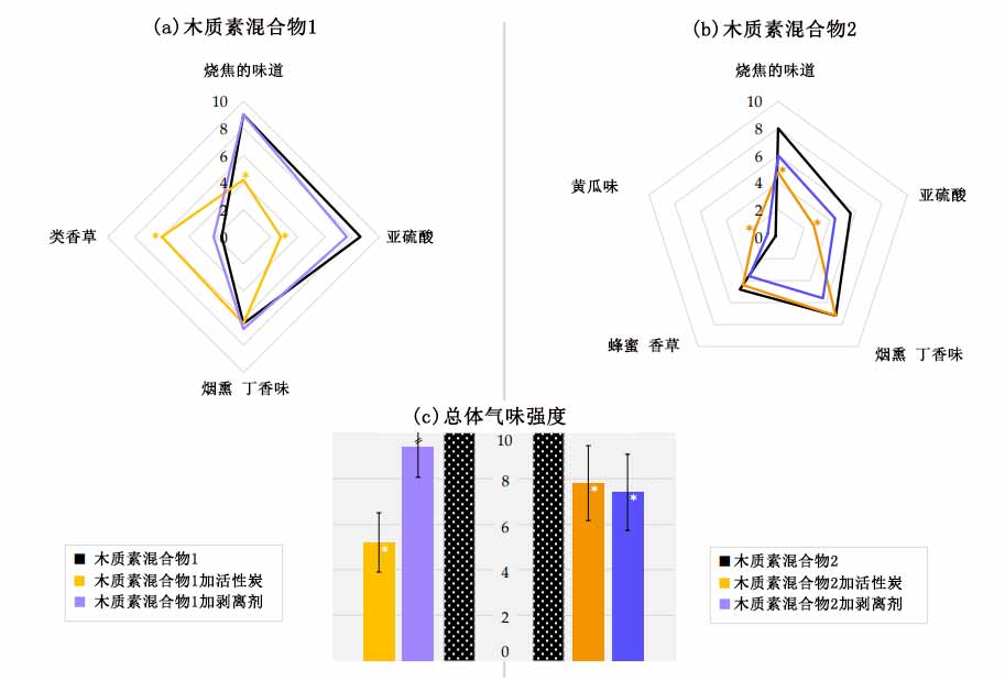 圖1:(a)木質(zhì)素混合物1和(b)混合物2的氣味特征,(c)用活性炭或汽提劑處理的兩種木質(zhì)素混合物的整體氣味的等級。