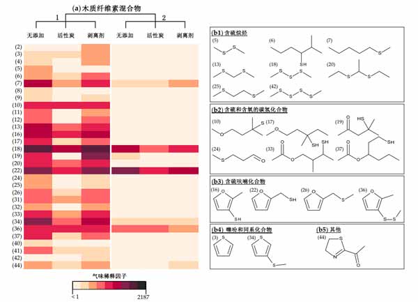 圖2:(a)在未處理和處理過的兩種木質(zhì)素混合物中檢測到的含硫氣味劑氣味稀釋因子的彩色差異和(b1-b5)硫氣味劑的結(jié)構(gòu)式根據(jù)其化學結(jié)構(gòu)分為亞組數(shù)字(2-44)是指氣味的連續(xù)順序。
