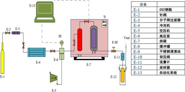 首先,來自儲罐的CO2通過標稱尺寸為1µ的過濾器,以避免任何雜質(zhì)進入工藝路徑。然后,CO2被引導(dǎo)至冰箱單元,其溫度降至-10℃和60bar。液化CO2使用往復(fù)泵加壓,并轉(zhuǎn)化為殼管式配置的調(diào)壓鼓。在這個鼓中,流體溫度被設(shè)置為適當?shù)臏囟纫赃_到超臨界流體條件。該鼓的設(shè)計旨在減少波動,熱交換通過使用溫度精度設(shè)置為1K的1000W元件循環(huán)水進行。壓力表安裝在調(diào)壓鼓的輸出端,以顯示出口流體壓力。之后,液體被引導(dǎo)到裝有10克活性炭和玻璃珠的萃取池。在提取單元的輸入和輸出處安裝了兩個孔隙率為1微米的過濾器,以防止顆粒逸出。細胞中玻璃珠的存在使CO2均勻分布在提取單元內(nèi)。在用SC-CO2加載萃取池后,將萃取池設(shè)置在適當?shù)臏囟群蛪毫ο录s45分鐘。在靜態(tài)階段之后,動態(tài)階段從打開采樣閥開始。為了防止閥門凍結(jié),它被包裹在加熱元件中。在動態(tài)時間內(nèi),使用冰柜將樣品采集溫度保持在0℃以下。每個實驗一式三份進行,圖1顯示了超臨界流體裝置的詳細信息,通過將每個初始活性炭的溶質(zhì)重量除以計算超臨界回收率。