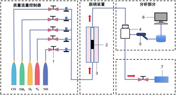 圖2:氣體反應裝置示意圖(1)轉子流量計,(2)催化劑,(3)固定床反應器,(4)緩沖氣瓶,(5)探測槍,(6)煙氣分析儀,(7)廢氣回收裝置。