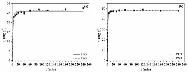 研究了初始吸附物濃度為50mgL-1和pH4的兩種活性炭的亮藍(lán)染料染料吸附動力學(xué)行為。作為時間函數(shù)的吸附容量曲線分別如圖3a、b所示,分別為活性炭1和2。可以觀察到活性炭2獲得的曲線的特征在于更快的吸附速率。活性炭2在大約10分鐘內(nèi)達(dá)到平衡。對于活性炭1,在大約60分鐘內(nèi)達(dá)到平衡。由于活性炭1呈現(xiàn)的較高總孔體積,可以解釋這種行為。高孔體積可以通過允許染料分子在孔內(nèi)更快地擴(kuò)散到吸附位點(diǎn)來增強(qiáng)吸附動力學(xué)。