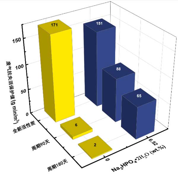 使用Na2HPO4·2H2O添加劑的實驗在6.52%的濃度下進行,其摩爾當量相當于5.15%的NaH2PO4·H2O濃度。圖3的結(jié)果表明,Na2HPO4·2H2O添加劑也能有效防止失活,但不如NaH2PO4·H2O有效。例如,失活180天后,防護值含有Na2HPO4·2H2O添加劑的活性炭濃度下降至65mg/min/m3相比之下,使用NaH2PO4·H2O添加劑的活性炭為107mg/min/m3。