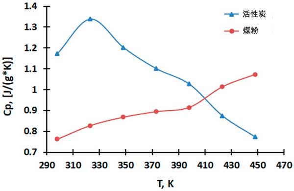 圖1:煤粉和活性炭的Cp~f(T)的圖形依賴性。