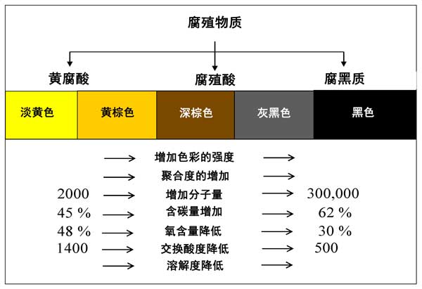 腐殖質的性質與其成分有非常密切的聯系,其成分受到腐殖化過程的影響,與分子(分子量)和顆粒的大小、分散程度(真溶液或膠體溶液)、極性(由這些決定)由骨架的性質(芳香族;脂肪族)決定,主要是官能團的類型、數量和解離能力。腐殖質成分的功能在于其在水中的溶解度(黃腐酸的溶解度比腐植酸高,因此天然水中平均含有87%的黃腐酸)、聚集能力、解離能力(主要是羧基)官能團)和相關的電荷比(粒子的zeta電位)。腐殖質的一些特性也受到水的成分及其pH值的影響。圖1顯示了腐殖質的基本特性。