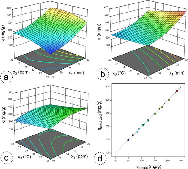 圖3:3D響應曲面圖說明了雙自變量的綜合影響(a)接觸持續時間與入口濃度(x1—x2)、(b)接觸持續時間與溫度(x1—x3)和(c)入口濃度與溫度(x2—x3)和(d)比較苯吸附的實際吸附容量(q)和預測吸附容量(q)的圖。