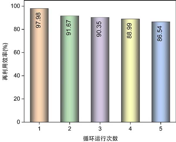 吸附劑的可重復使用性和吸附穩定性在評估所開發方法的實際適用性方面起著至關重要的作用。事實上,吸附劑的可重復使用性能是實際應用的首要標準,并影響吸附過程的總體成本。活性炭苯蒸汽吸附的再利用效率是在五個連續的回收循環后確定的。如圖4所示,經過五次連續回收過程后,活性炭苯蒸氣的再利用效率為86.54%。強大的可重復使用性和吸附穩定性表明活性炭吸附劑和苯吸附物之間存在范德華力或π-π相互作用。相反,不完全的再生過程可歸因于吸附表面上永久鍵的形成,導致吸附基團的不可逆轉化。換句話說,一些在再生過程中未解吸的化學結合吸附物可能會堵塞孔隙,導致殘留物形成。