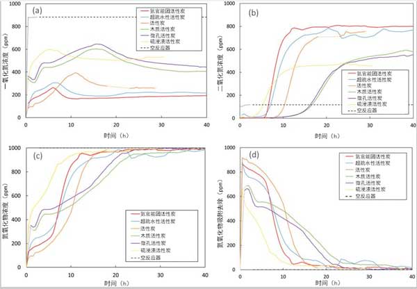 圖1:在環(huán)境溫度和壓力下的干燥測(cè)試條件下,不同活性炭在NO氧化過(guò)程中一氧化氮的濃度曲線。