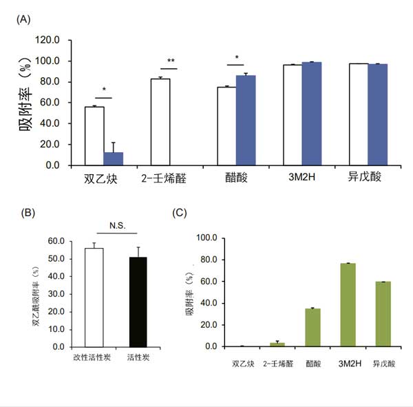 我們測試了活性炭對五種散發(fā)惡臭的揮發(fā)性有機化合物的吸附能力。發(fā)現(xiàn)活性炭對二乙;2-壬烯醛的吸附水平均高于氧化鋅。但是,與醋酸氧化鋅相比,活性炭的吸附效果略低(圖3A)。相反,活性炭和氧化鋅對3M2H和異戊酸的吸附能力之間沒有顯著差異。為了比較活性炭和改性活性炭中所含活性炭的吸附能力,使用無法吸附在二氧化鈦上的二乙;鶞y試了相同量活性炭中的吸附水平。發(fā)現(xiàn)與活性炭相比,改性活性炭的吸附能力沒有顯著變化(圖3B)。