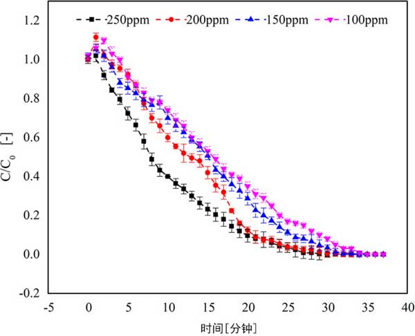 圖2:改變進氣中三氯乙烯的初始濃度對活性炭吸附能力的影響。