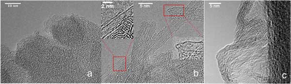 選擇了三種活性炭,代表三種不同的孔幾何形狀,同時保留了化學(xué)均一的吸附表面和可比較的孔徑。選定的樣品是由隨機(jī)排列的石墨層組成的活性炭,具有狹縫孔幾何形狀的碳化鈦衍活性炭和具有圓柱孔幾何形狀的活性炭納米管樣品。對活性炭納米管進(jìn)行熱處理,以去除端蓋,并使氣體進(jìn)入內(nèi)部孔隙。選擇加熱條件以將活性炭納米管的開孔率和BET表面積調(diào)整到與其他兩個碳樣品相當(dāng)?shù)乃剑瑫r還清潔表面并去除雜質(zhì)。所有三個樣品的特征如下:使用透射電子顯微鏡(TEM)圖1證明了這些材料的孔幾何形狀的差異。