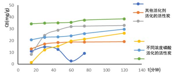 活性炭的吸附時(shí)間影響可從圖1看出,活性炭吸附分三步進(jìn)行:第一是在最初的30分鐘內(nèi),污染物的吸附量很快就被確定了,這可以用在吸附劑的外表面存在大量空置的結(jié)合位點(diǎn),這使得吸附劑易于吸附到該表面。第二在31分鐘后,吸附速率降低,過(guò)程緩慢;钚蕴康钠渌恢眠_(dá)到飽和后,污染物顆粒將遷移到吸附劑內(nèi)部。由于易于接近,因此吸附過(guò)程緩慢:顆粒內(nèi)擴(kuò)散。第三從80分鐘開(kāi)始,我們觀察到一次接觸,活性炭已達(dá)到其最大容量。我們可以說(shuō)這些吸附劑的平衡時(shí)間是80分鐘。然而,磷酸活化的活性炭吸附量的演化曲線顯示,在最初的30分鐘內(nèi),污染物的吸附量顯著增加,此后,污染物的吸附量急劇下降,這將是一種產(chǎn)物解吸。這一現(xiàn)象在其他吸附劑中是不可見(jiàn)的,這可能意味著可用孔隙的數(shù)量和結(jié)合力隨著所用活化劑濃度的增加而增加,這一點(diǎn)還通過(guò)碘值和亞甲基藍(lán)的值進(jìn)行了驗(yàn)證。