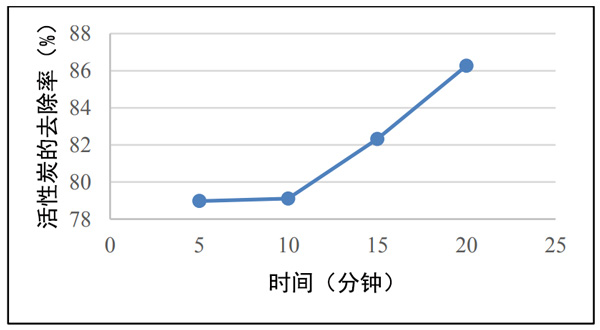 吸附時(shí)間測試:將豆腐廢液行業(yè)樣品溶液制備到四個(gè)燒杯中。在每杯中加入多達(dá)0.5克的椰殼活性炭。攪拌下靜置5分鐘,10分鐘,15分鐘,20分鐘。之后,用移液管吸取10mL溶液,然后將其放入試管中。加入0.4mL苯酚溶液,0.4mL硝普鈉,1mL氧化溶液。放置1小時(shí)以產(chǎn)生顏色。形成顏色后,使用濾紙將活性炭與樣品溶液分離。倒入比色杯,使用分光光度計(jì)對(duì)其進(jìn)行分析,讀取并記錄其在640nm波長處的吸收。時(shí)間變化的吸附用K2CO3活性炭和HCl活性炭進(jìn)行兩次。