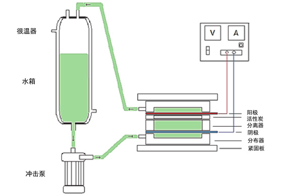 在這項研究中,已開發(fā)出用于溴化物電吸附的壓濾電化學電池。為了使電化學電池與受污染的水通過更寬的活性炭床接觸,已經(jīng)對其進行了修改。在實驗過程中,水通過離心泵在陽極和陰極之間循環(huán),并通過發(fā)現(xiàn)為床的活性炭。這樣,可以獲得有關該間歇反應器中吸附動力學以及平衡吸附量的信息。最后的數(shù)據(jù)對于了解由于施加電勢而可能提高活性炭的吸附容量非常重要。圖1中顯示了電化學電池和用于電吸附過程的設備的示意圖。