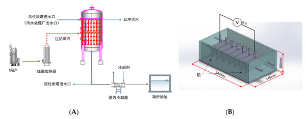 建造了一個用于微塑料去除實驗的中試規模的設施,該設施由帶有熱再生系統的活性炭塔組成。該設備在接觸塔中運行時的總質量約為800千克活性炭。這個設施是由活性炭單元和過熱蒸汽單元組成的可熱再生裝置。該活性炭塔系統是在污水處理廠上建立的,收集污水樣本以進行微塑料分析。如圖所示圖1A,蒸汽鍋爐中產生高于100℃的飽和蒸汽,并通過管線加熱器轉換為500-700°C的過熱蒸汽。蒸汽過熱進行熱解過程,是由轉換后的過熱蒸汽通過塔內的輻照管噴嘴在有效半徑內噴灑到活性炭上,并提高了活性炭的溫度。通過噴灑500-700°C的過熱蒸汽來蒸發活性炭孔中的水分,并且通過無氧低溫將吸附的一氧化碳或二氧化碳和低分子量化合物與有機物和微塑料分解為水。此時,將未分解的未溶解的低分子量有機化合物與冷凝水混合,并返回到污水處理廠的進水口。從活性炭再生裝置下部排出的蒸汽由熱交換器冷卻,然后引入冷凝水儲罐,并返回到污水處理廠進水或進行后處理。