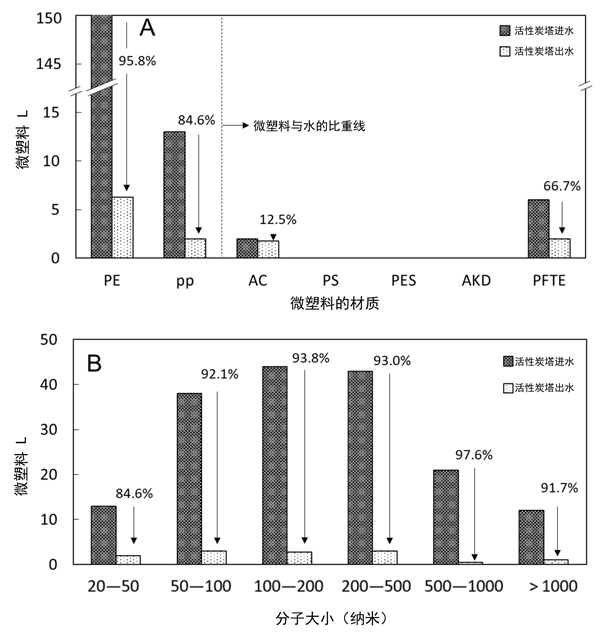 圖2:活性炭裝置對(A)不同材料和(B)不同尺寸范圍的微塑料顆粒的去除效率。PE:聚乙烯,PP:聚丙烯,AC:丙烯酸酯,PS:聚苯乙烯,PES:聚酯,AKD:醇酸樹脂,PTFE:聚四氟乙烯。