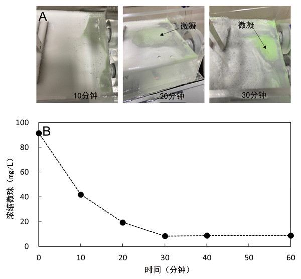 圖3:電凝實驗的結果:(A)微珠聚集的過程,(B)隨著時間的流逝通過離心濃縮不可分離的微珠。每個數據點都是重復實驗的平均值。